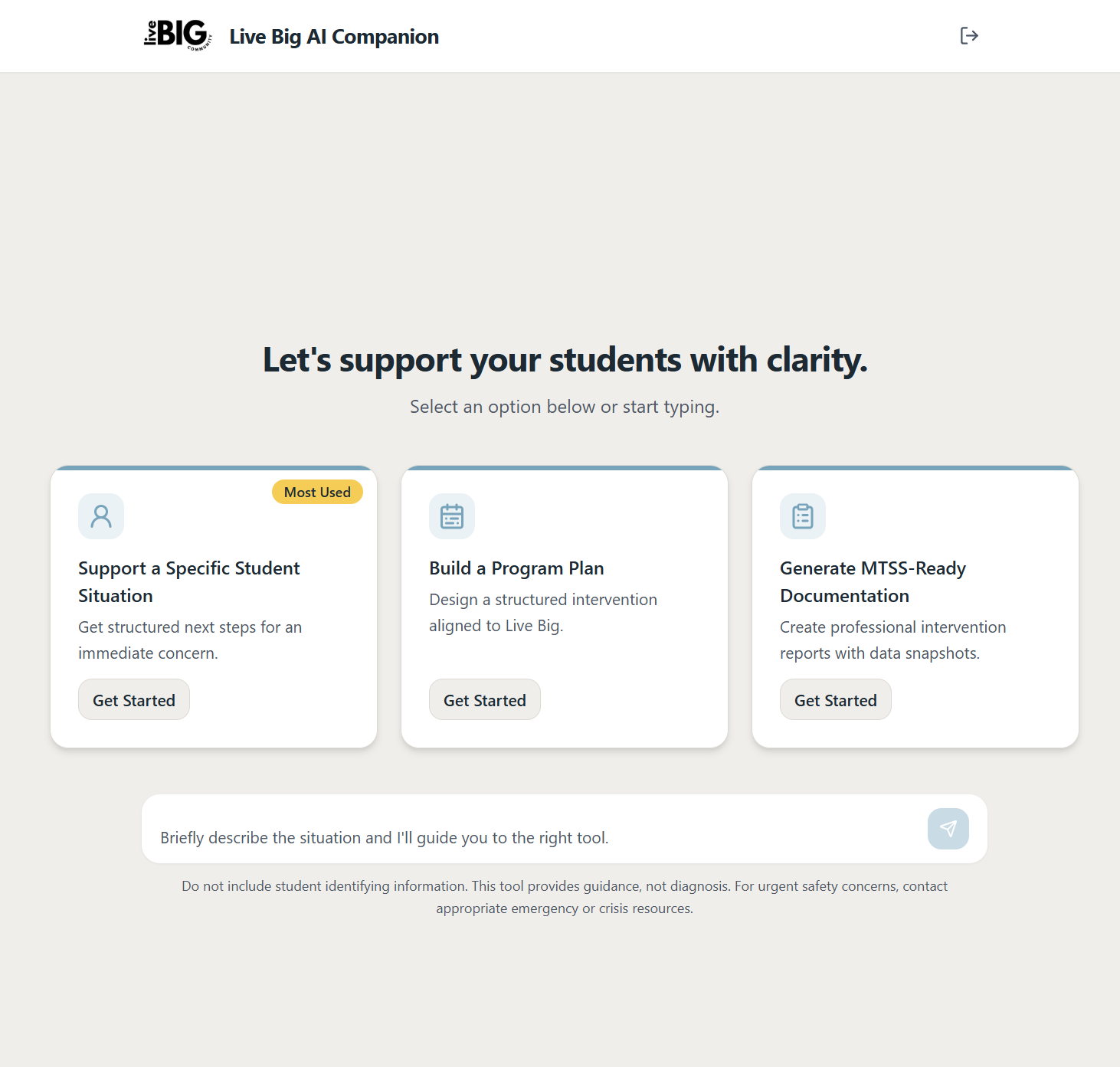 It’s designed to support how you implement Live Big curriculum in real school settings. From planning sessions to drafting documentation, it helps you do your job while staying aligned with our evidence-based approach.